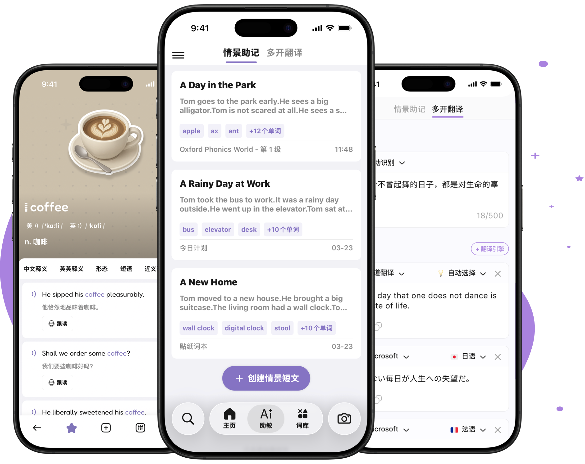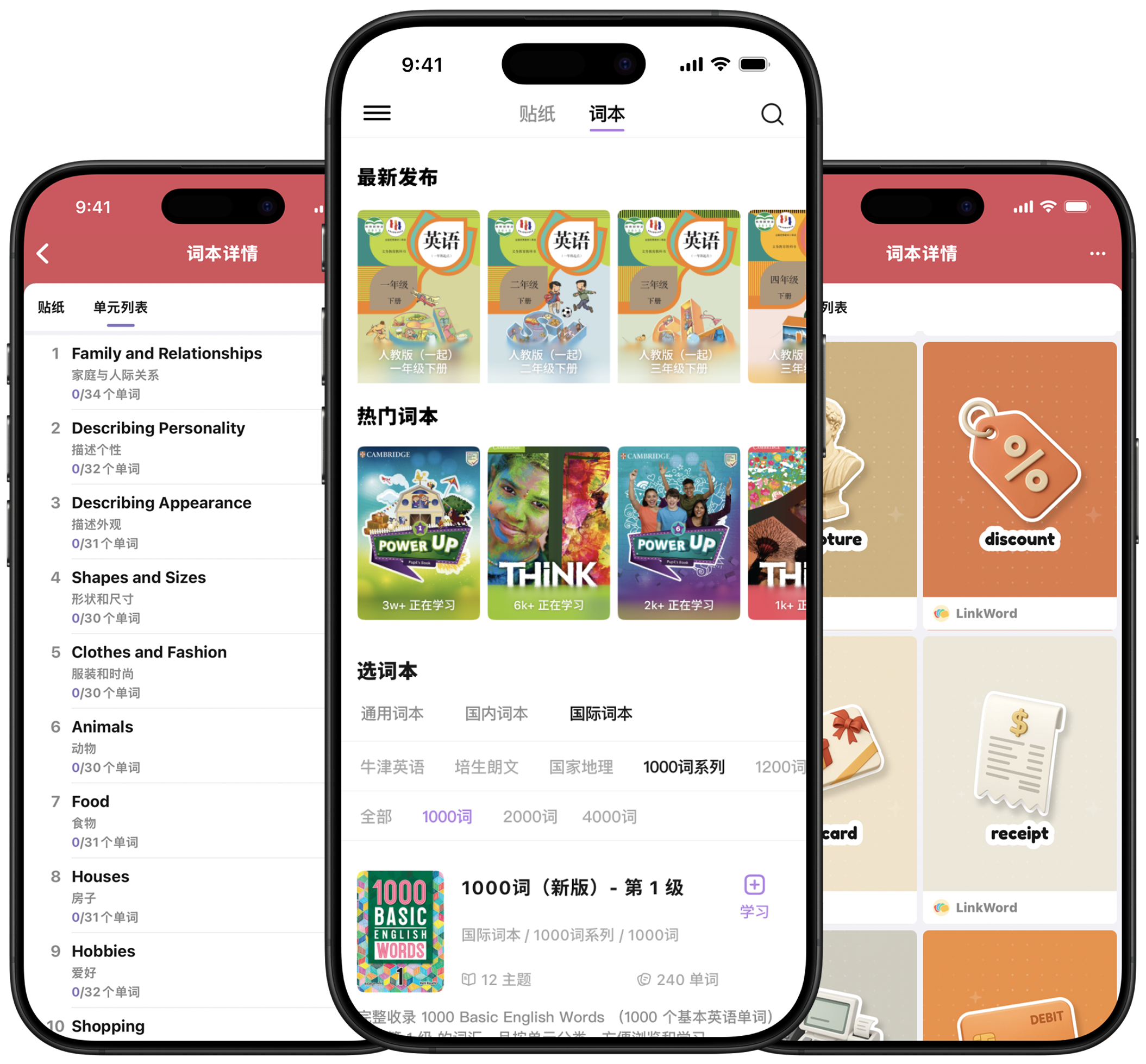 涵盖超过 100 个主流词库、教材分类,超过 900 个词本、场景话题,累计数万个单词、情景短语